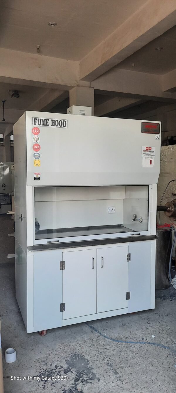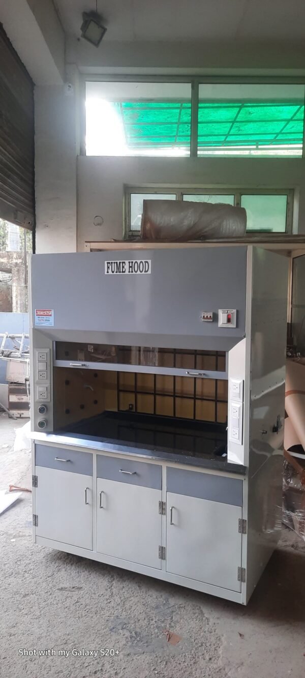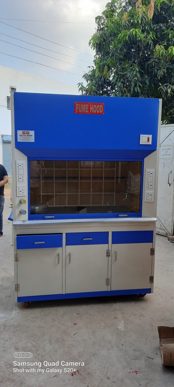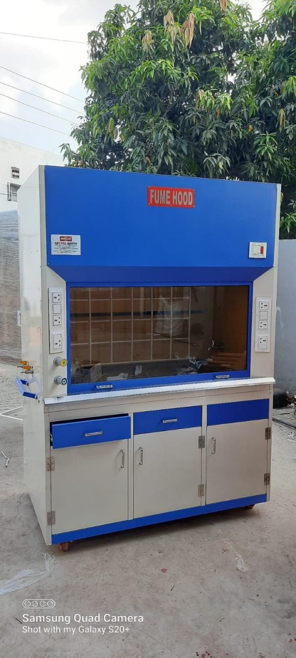 Fume exhaust hoods are designed to contain and throw out toxic,obnoxious pungent smelling gases to protect personal and equipment in the laboratories. A motor driven blower creates negative pressure and sucks contaminated air from work areas and throws it in high up atmosphere through ducting. Fabricated out of thick ply board clad from outside with laminated/mild steel powder coated/stainless steel sheet and inside finished in non-corrosive epoxy paint.An up-down sliding sash with glass sheet is provided. Flurescent lighting is also provided. A gas tap,water tap and wash basin is also provided.